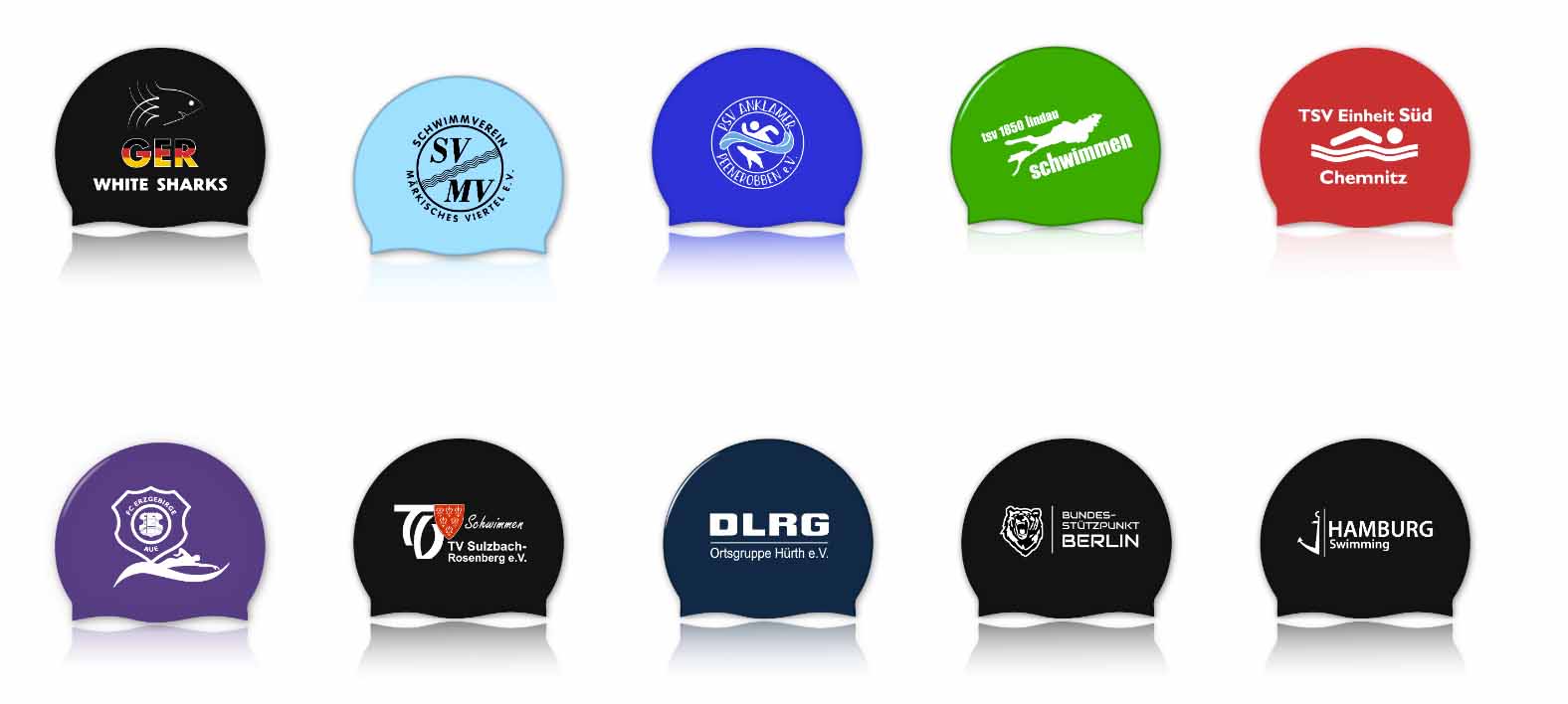 Wir bedrucken für euch Badekappen und unterstützen euch auch bei der Erstellung eines Designs, egal ob die Badekappen einfarbig oder mehrfarbig bedruckt werden sollen! Schon rund 100 Vereine vertrauen auf unseren Badekappen-Service!